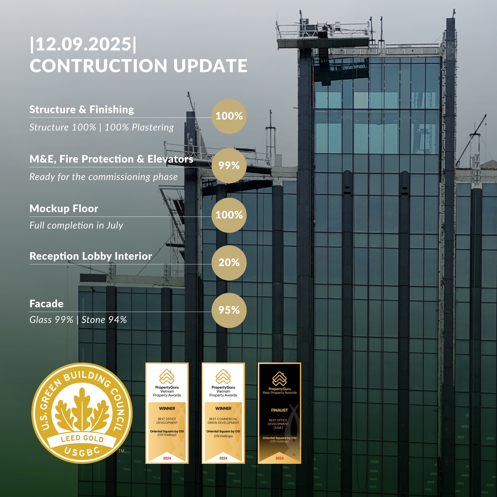 Oriental Square by OSI Holdings is undergoing steady transformation. Glass installation and exterior stone cladding are progressing rapidly, remaining firmly on track for handover in Q4 2025