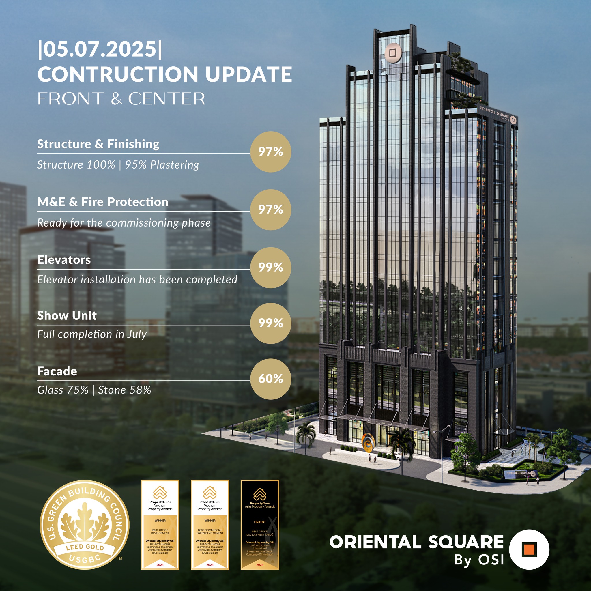 Oriental Square by OSI Holdings is undergoing steady transformation. Glass installation and exterior stone cladding are progressing rapidly, remaining firmly on track for handover in Q4 2025.