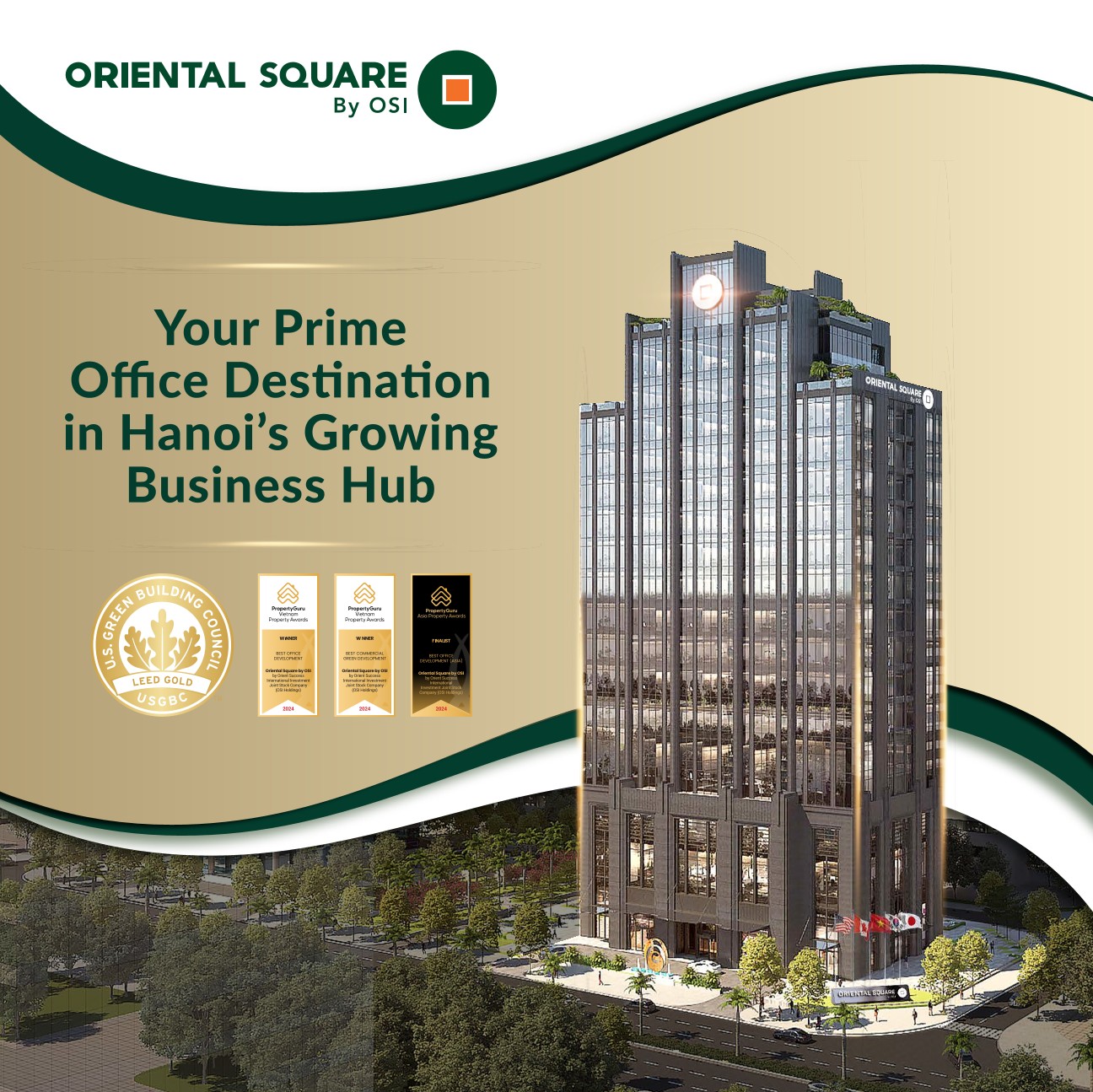 Lease Grade A office & prime commercial space at Oriental Square by OSI (Starlake Tay Ho Tay). Designed to meet LEED Gold, advanced facilities, ideal for business growth.