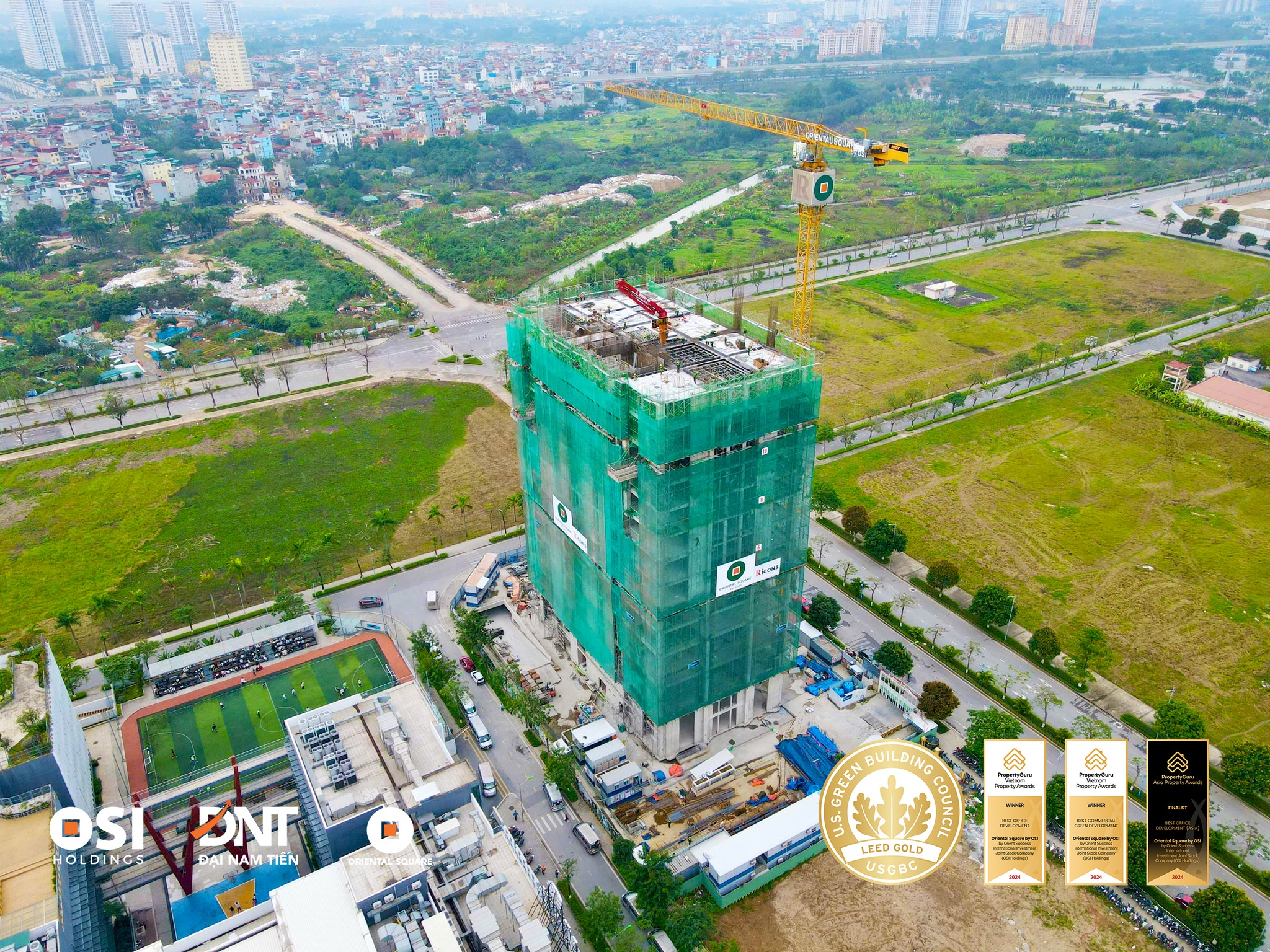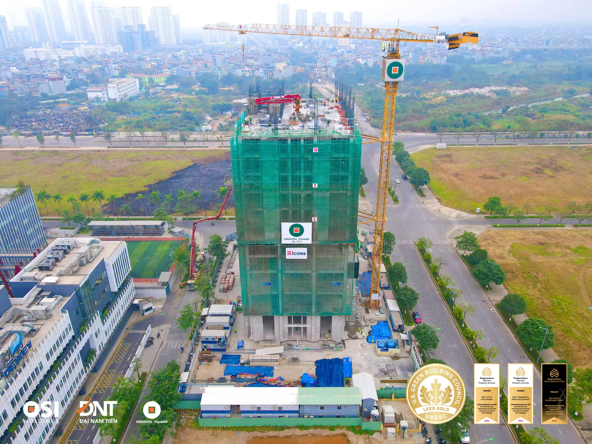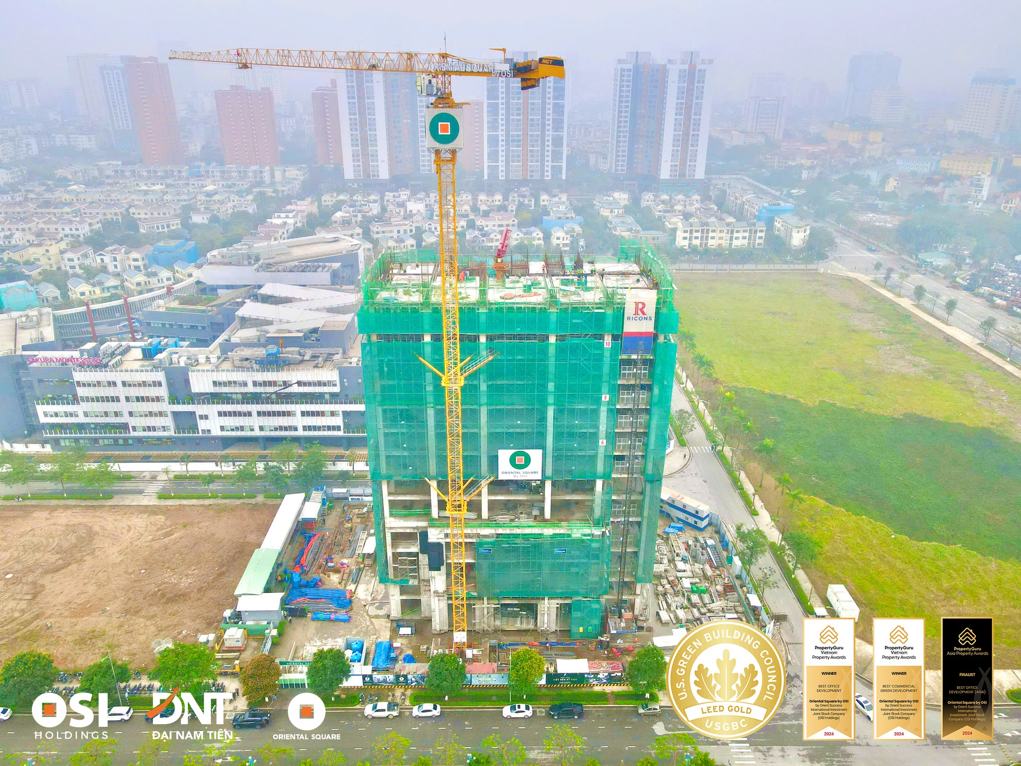 On March 3, 2025, the Grade A office building Oriental Square, developed by OSI Holdings, is currently under construction, focusing on the columns and walls of the 9th floor, as well as the beams/slabs for floors 12, 12A, and the technical floor.
